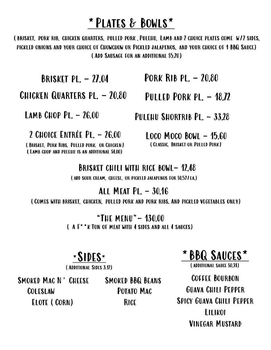 Served with two sides such as mac n cheese, BBQ beans, coleslaw, potato mac, elote (corn) or rice. Choice of sauces includes coffee bourbon, guava chili pepper, lilikoi or vinegar mustard.